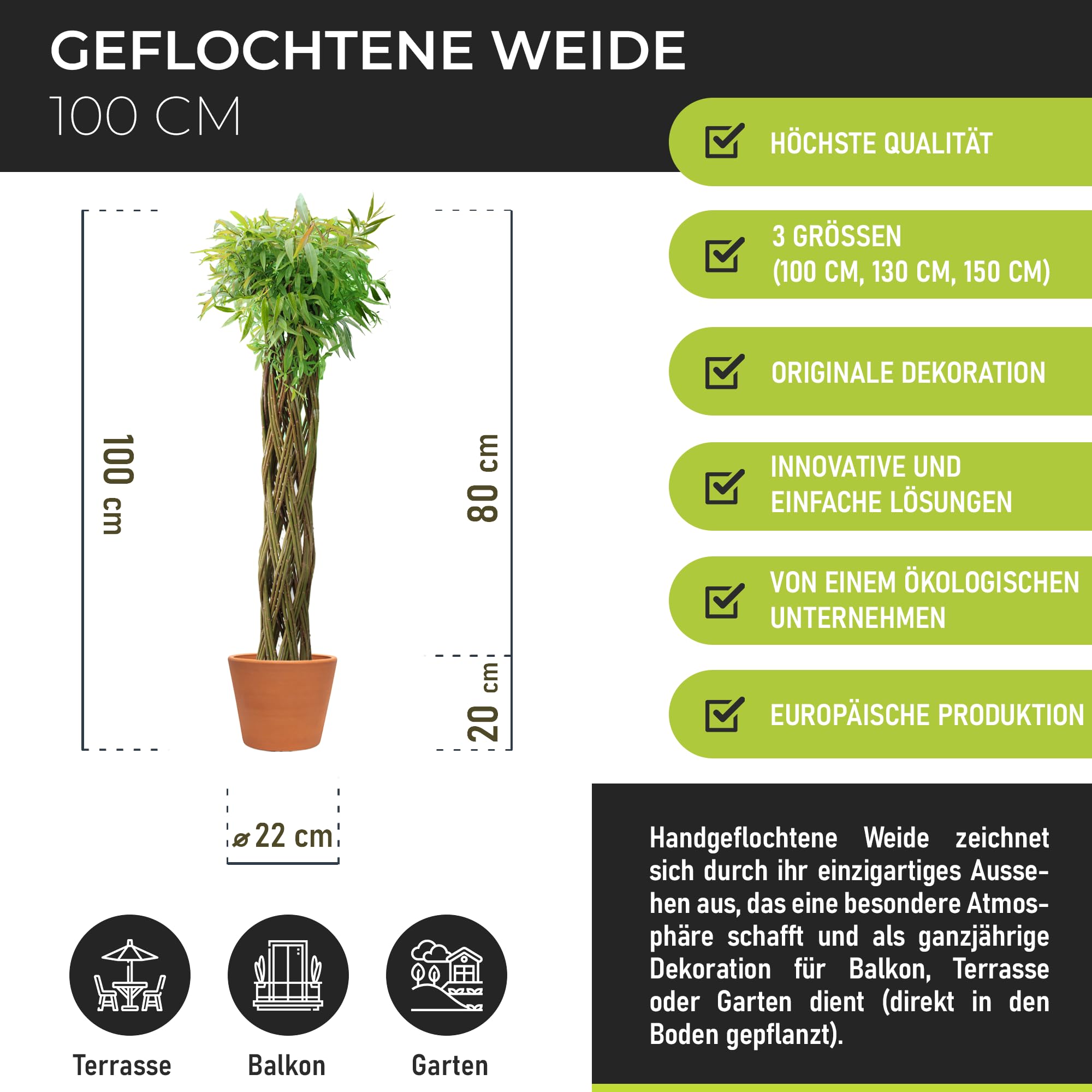 Wicker garden Natürliche Eleganz – Handgefertigte Geflochtene Weide in 3 Größen: 100, 130 und 150 cm