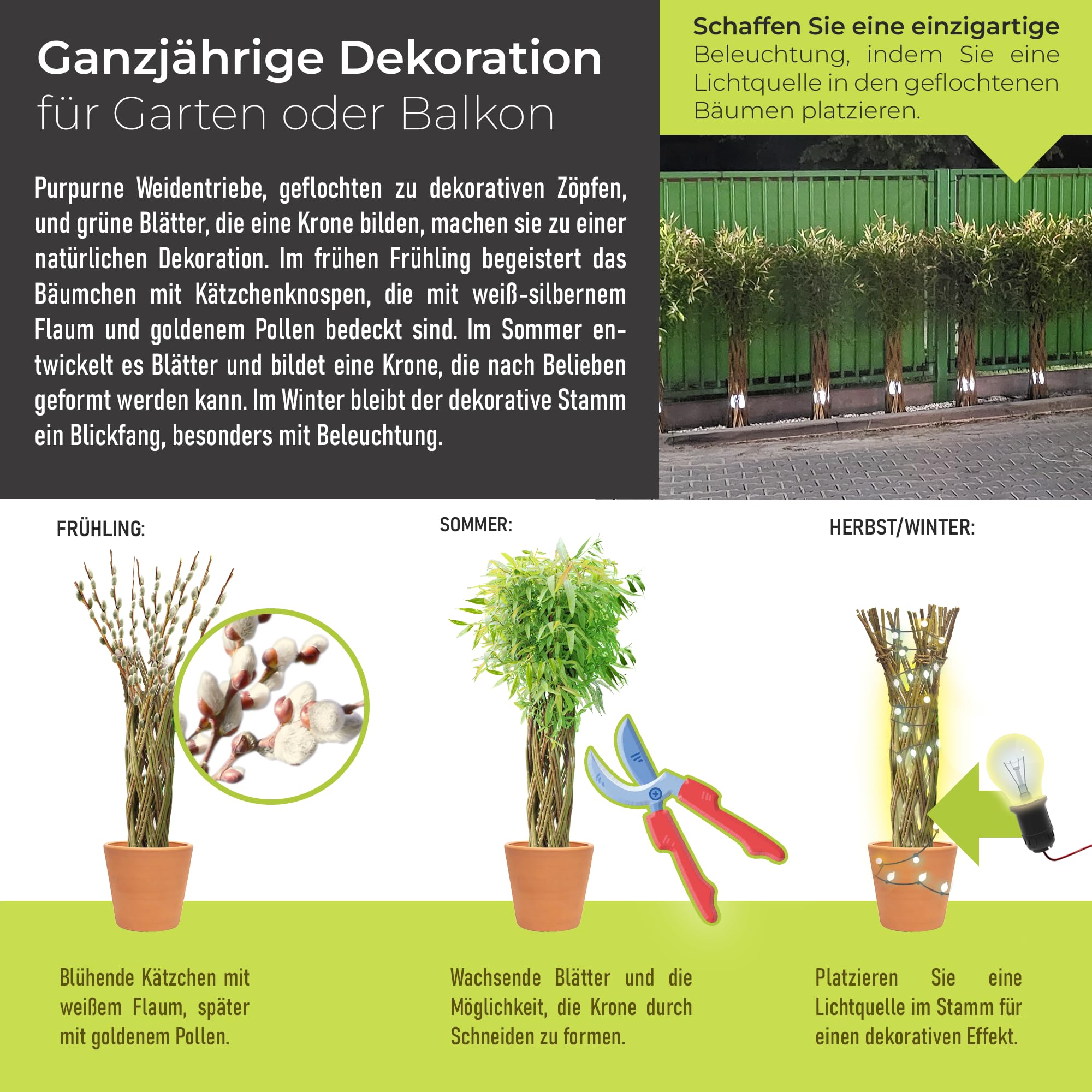 Die geflochtene Weide eignet sich sowohl für die Pflanzung in Kübeln als auch für das direkte Einsetzen in den Gartenboden. Im Winter verliert sie zwar ihre Blätter, doch der dekorativ verflochtene Stamm bleibt ein attraktiver Hingucker – insbesondere, wenn man ihn mit kleinen Lichterketten in Szene setzt.