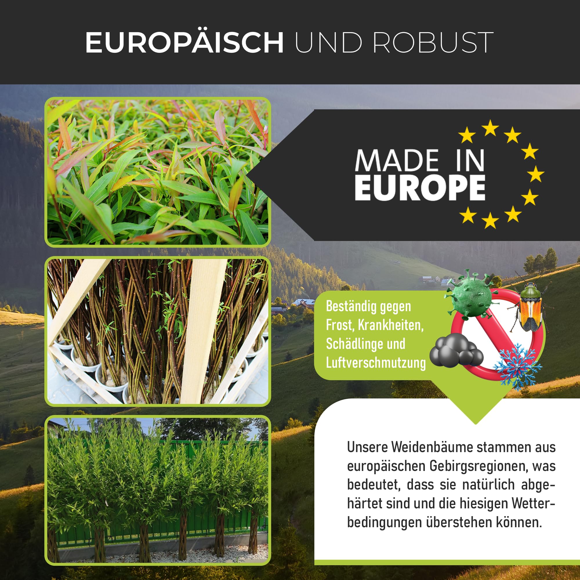 • Einfache Pflanzung – Dank unseres innovativen Systems mit biologisch abbaubarem Pflanzbeutel bleibt das Flechtwerk stabil.